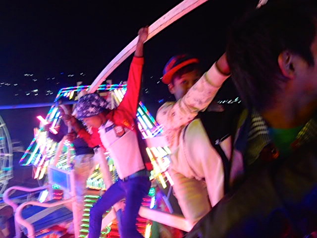 The next 10 minutes were the most chaotic, terrifying and exhilarating 10 minutes of recent memory. I noticed that the old, wooden frame had started to shake. And then our chair started to rock. I looked over to see the teenage boys quickly scaling the Ferris wheel, laughing and headed straight for us. They climbed onto and around our chair. Bad childhood memories flashed back. We were screaming. Very loudly. Katharine yelled “Oh God, oh God, oh God. This is how people die!” I shouted, with a strange amount of authority, “STOP! NO!! What is going on?!?!” They began using their body weight to turn the Ferris wheel. Jumping and swinging from one bar to the next like monkeys. We started to pick up speed, and our terror turned to glee.